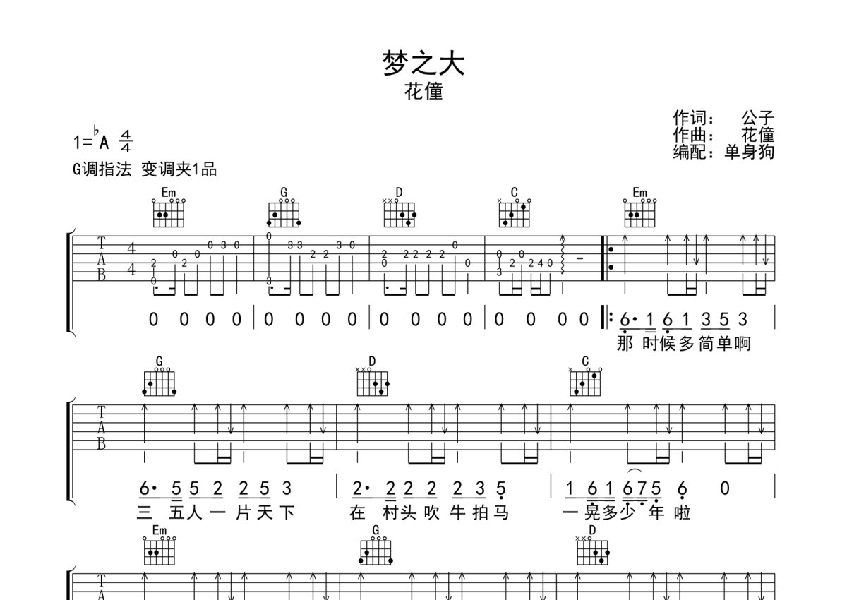 花僮《梦之大》吉他谱 - G调弹唱六线谱