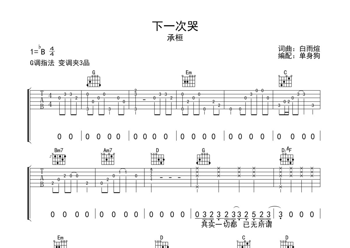 承桓《下一次哭》吉他谱 - G调弹唱六线谱