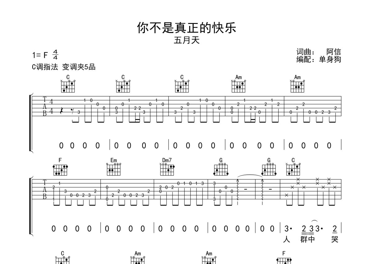 五月天《你不是真正的快乐》吉他谱 - C调弹唱六线谱