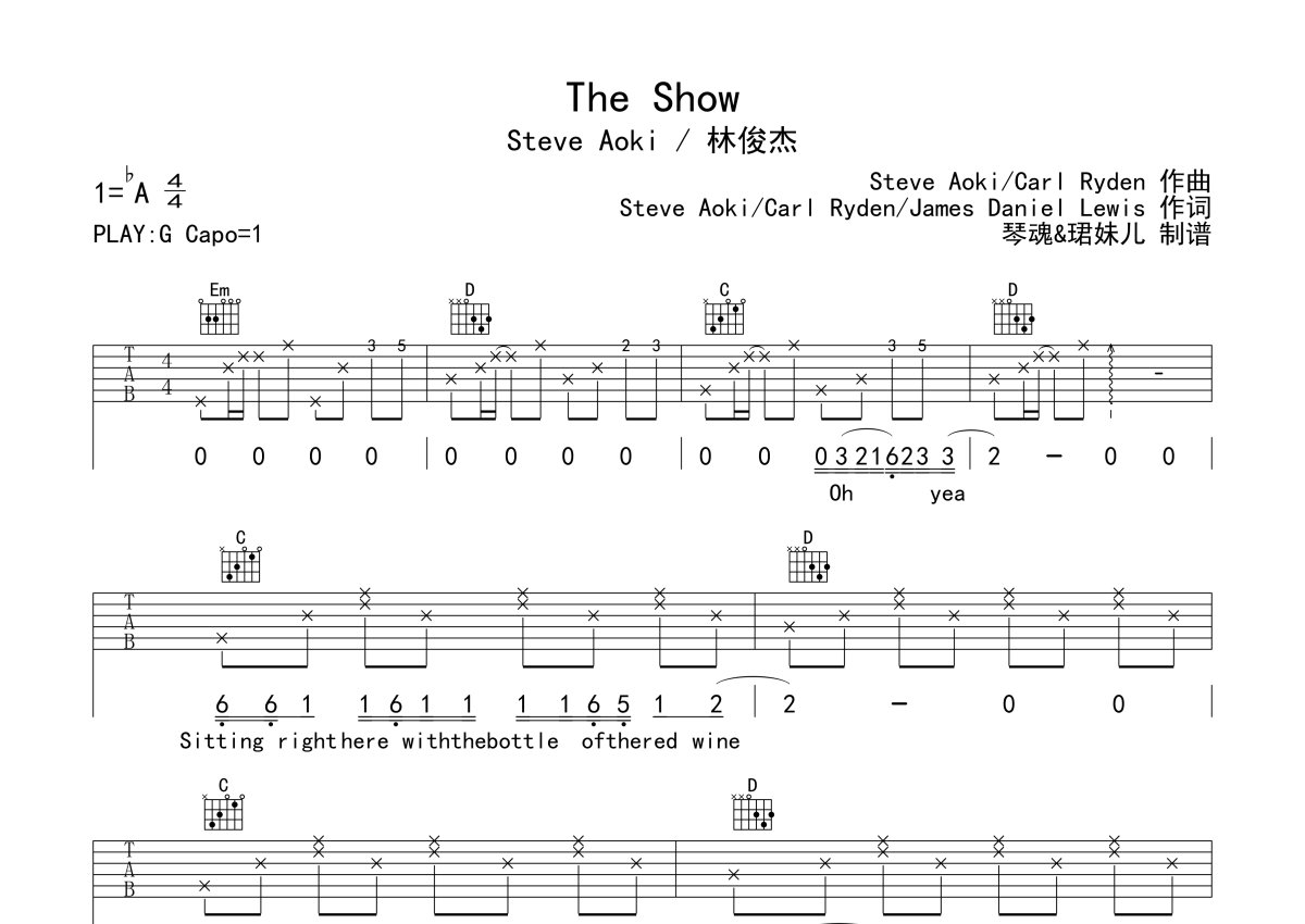《The Show》是Steve Aoki /林俊杰演唱的一首歌曲,本吉他谱采用的是G调指法编配,这份吉他谱共有四张高清图谱,图谱由 @珺妹儿 编配上传,图谱使用六线谱编配,包含吉他和弦指法、简谱以及歌词部分,使用这份The Show吉他谱,可以让你更加方便地掌握这首歌曲的弹唱技巧,快来尝试吧。G调指法编,弹唱建议变调夹1品,速度85难度较简单,易上手。