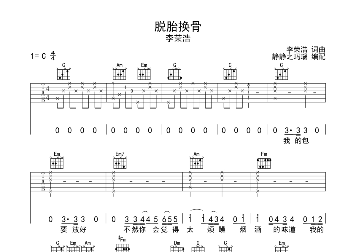李荣浩《脱胎换骨》吉他谱 - C调弹唱六线谱