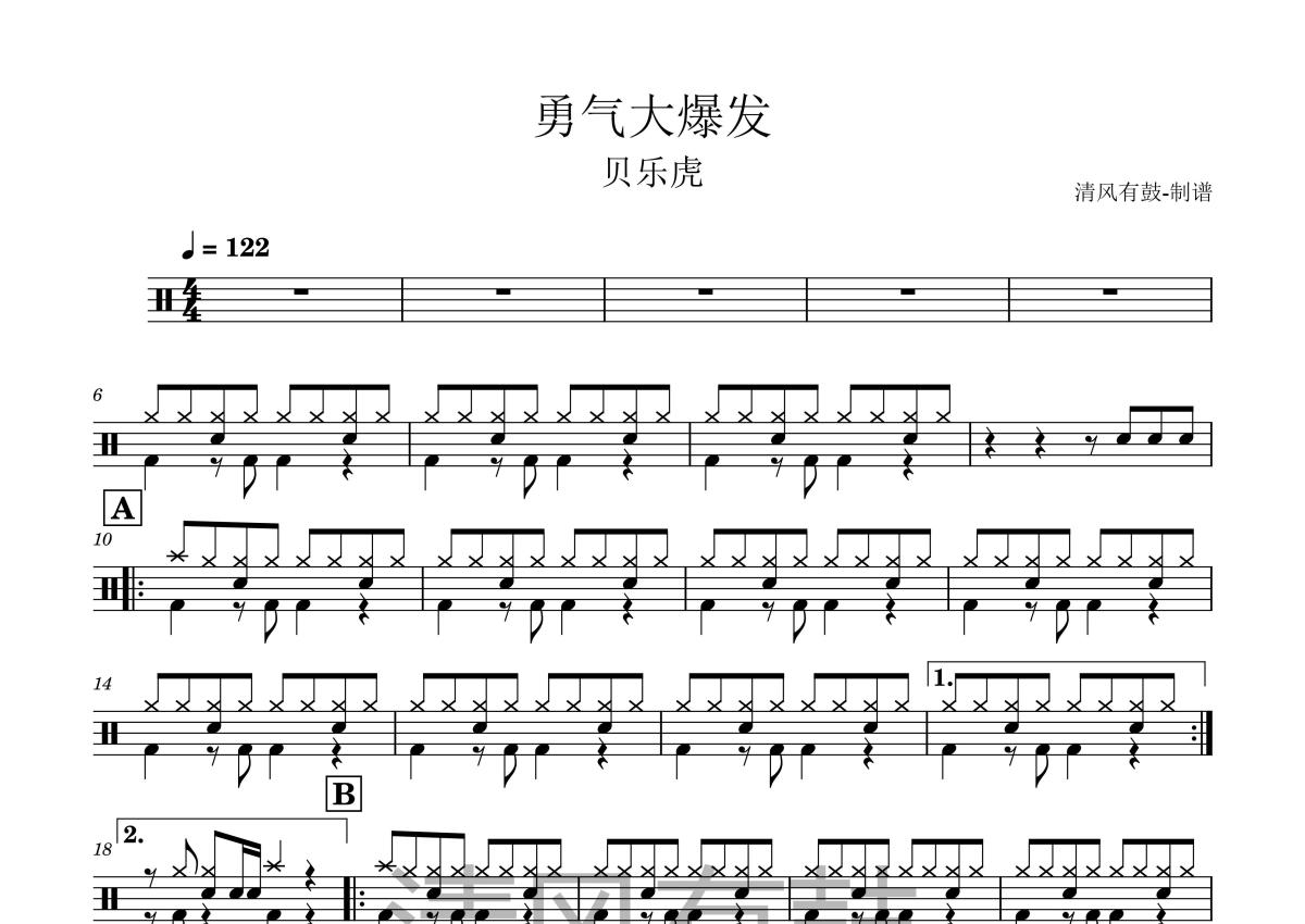 《勇气大爆发》是贝乐虎演唱的一首歌曲,这份鼓谱共有两张高清图谱,图谱由 @王远康 编配上传,图谱使用五线谱编配,使用这份勇气大爆发架子鼓谱,你将能够轻松地敲打出这首贝乐虎的勇气大爆发,快来尝试吧。