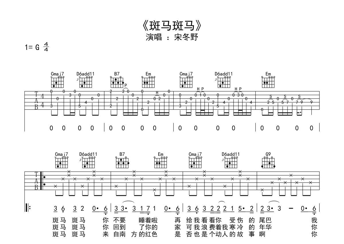 宋冬野《斑马斑马》吉他谱 - G调弹唱六线谱