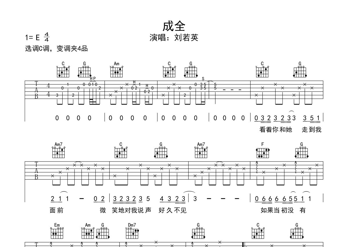 刘若英《成全》吉他谱 - C调弹唱六线谱