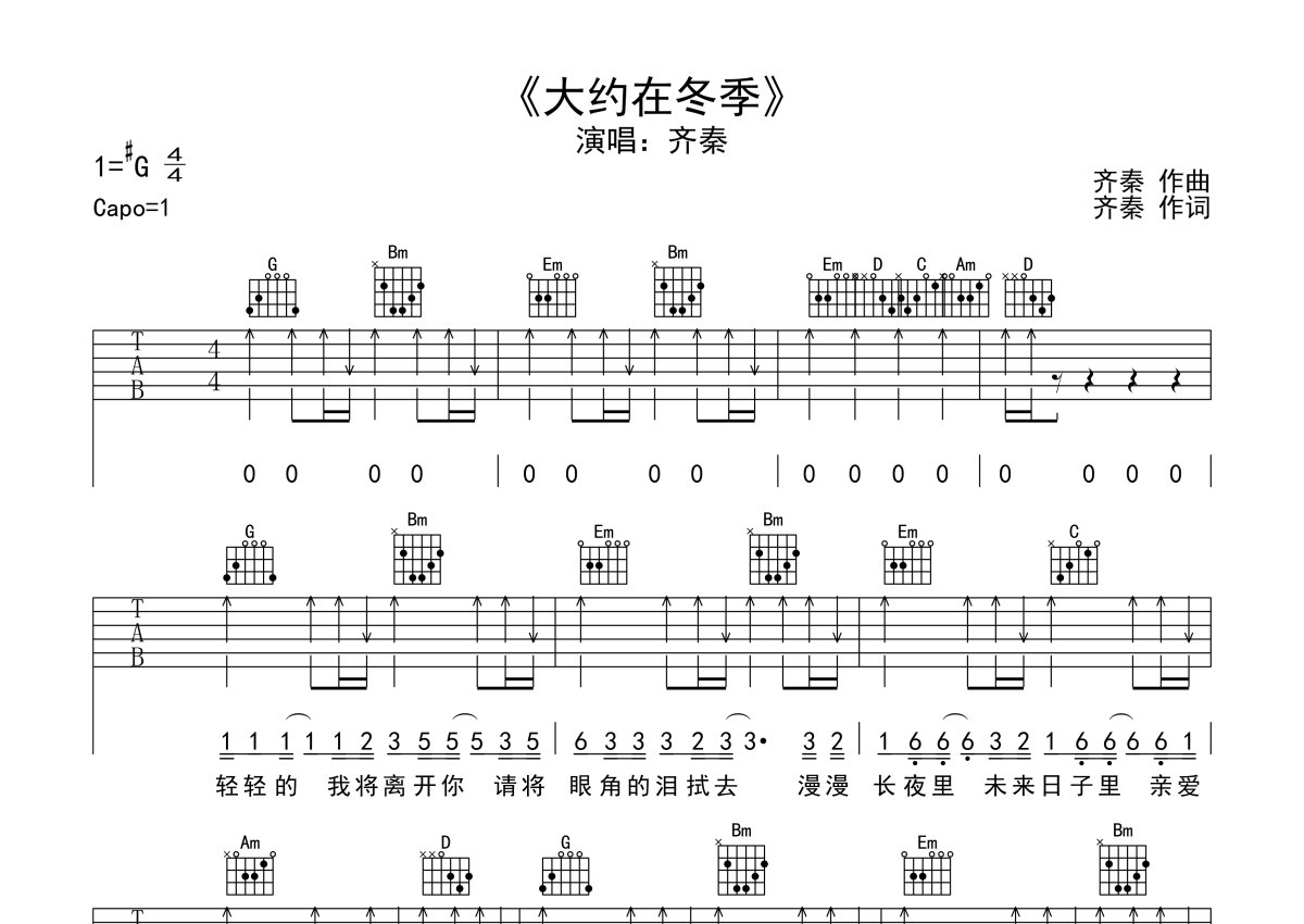 齐秦《大约在冬季》吉他谱 - G调弹唱六线谱