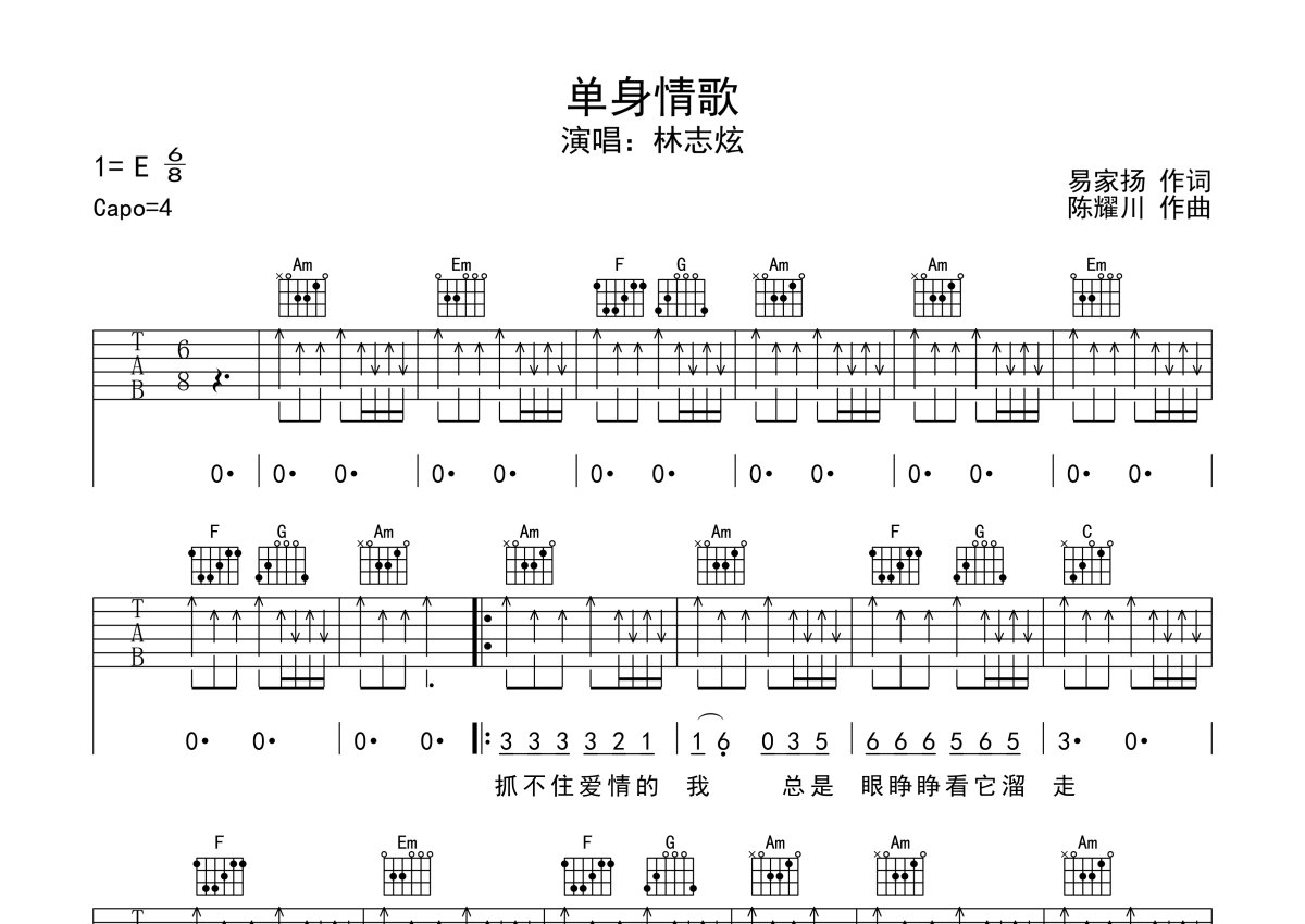 林志炫《单身情歌》吉他谱 - C调弹唱六线谱