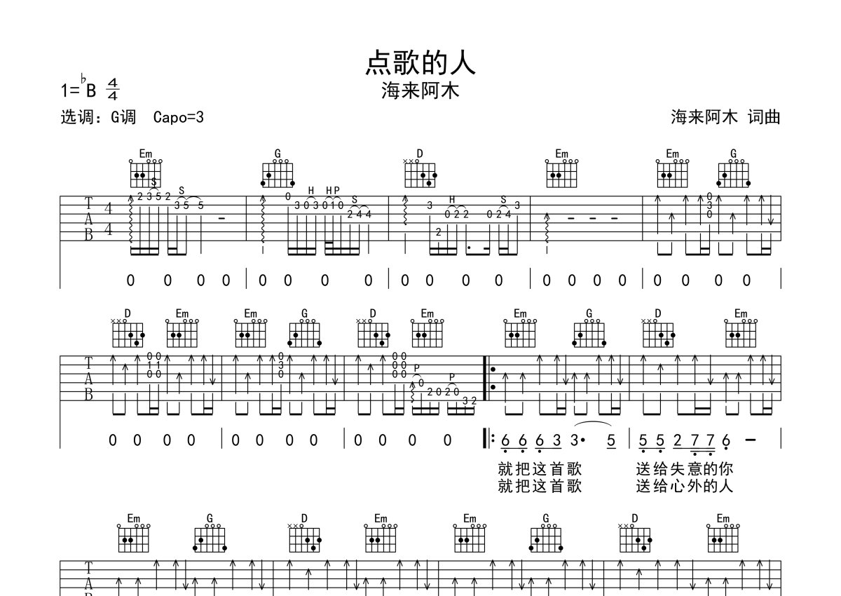 海来阿木《点歌的人》吉他谱 - G调弹唱六线谱