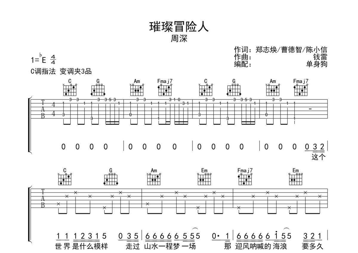周深《璀璨冒险人》吉他谱 - C调弹唱六线谱