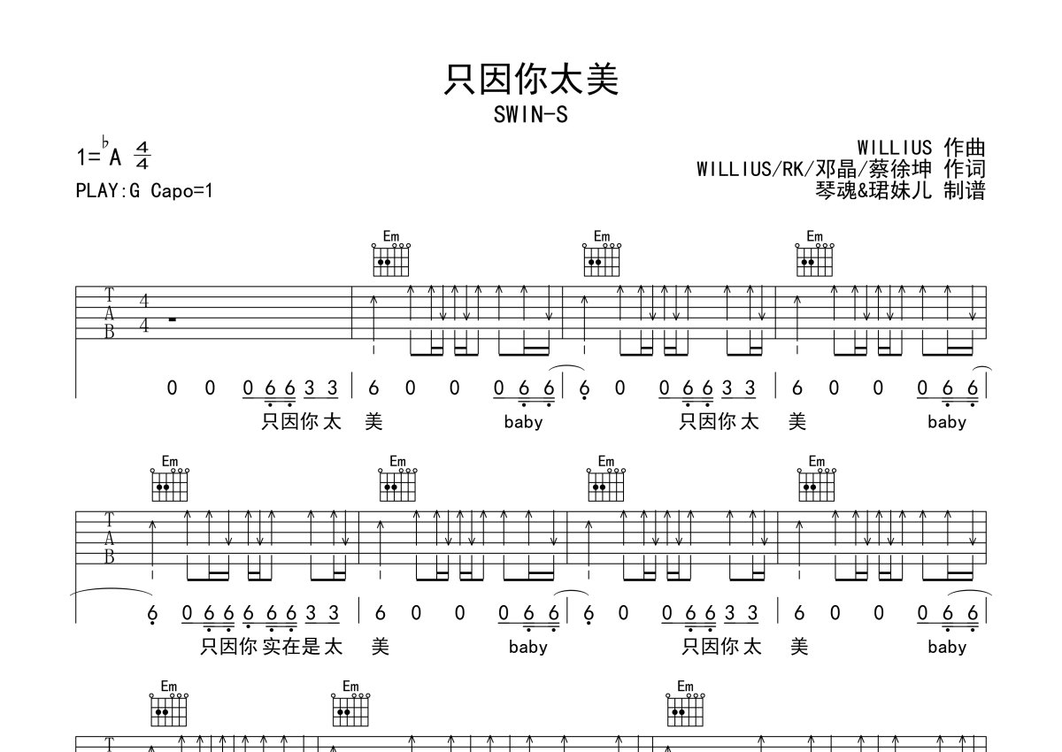 《只因你太美》是SWIN-S演唱的一首歌曲,歌曲原调为Ab调,但由于原调指法比较难,为了方便弹奏,本吉他谱采用的是G调指法编配,变调夹1品弹奏即为原调,当然也可以根据自己的音域改变变调夹位置,或者通过改变和弦调性,以方便自己弹奏,这份吉他谱共有四张高清图谱,图谱由 @珺妹儿 编配上传,图谱使用六线谱编配,包含吉他和弦指法、简谱以及歌词部分,使用这份只因你太美吉他谱,可以让你更加方便地掌握这首歌曲的弹唱技巧,快来尝试吧。