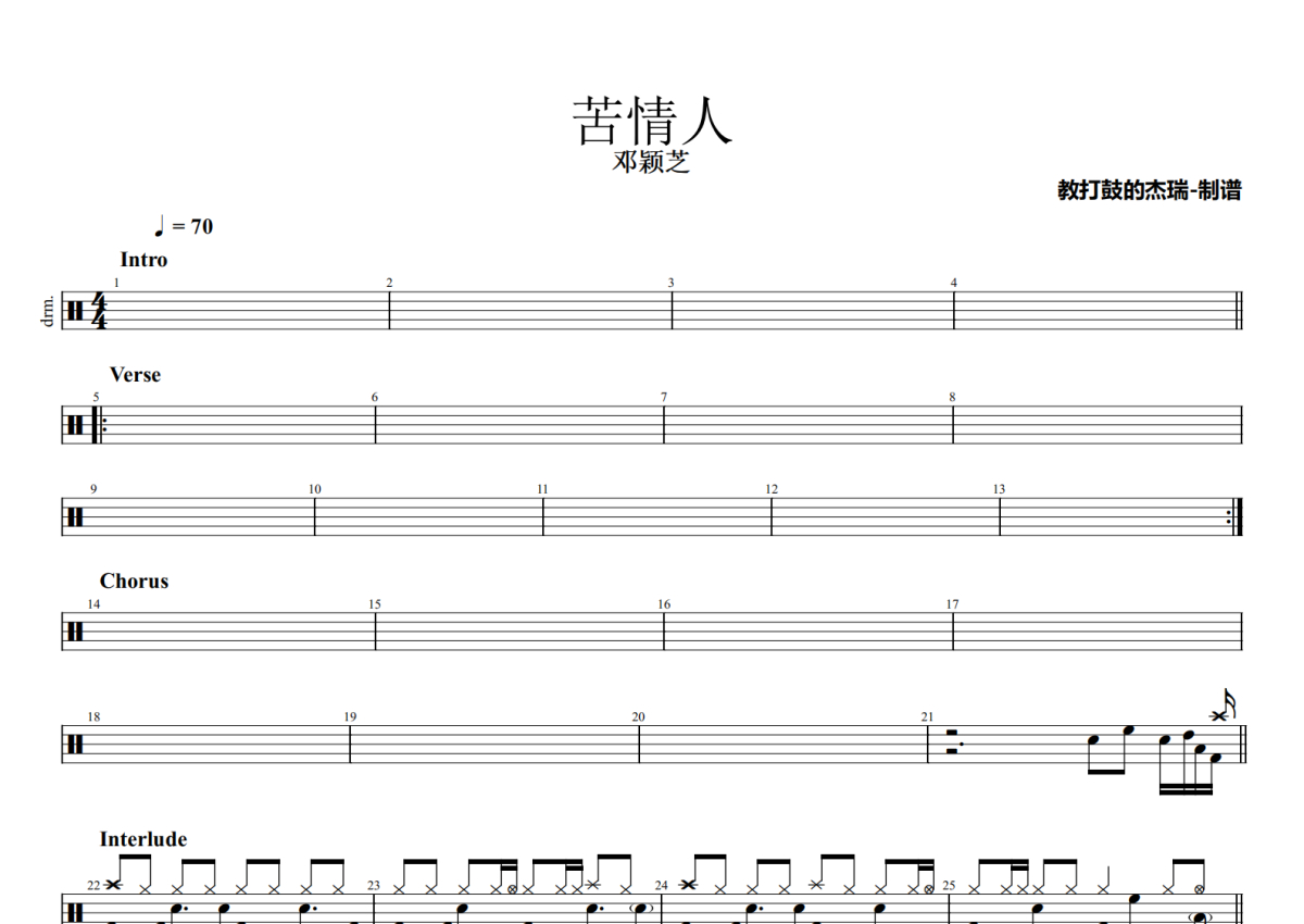 邓颖芝《苦情人》鼓谱 - 架子鼓谱