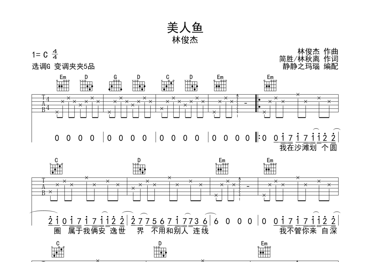 林俊杰《美人鱼》吉他谱 - G调弹唱六线谱