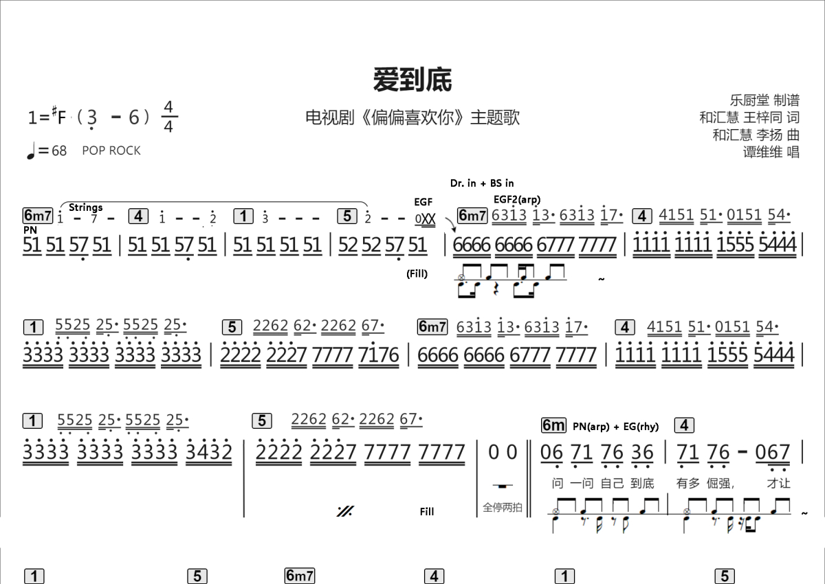 《爱到底》是谭维维演唱的一首歌曲,乐队标准伴奏谱,这份乐队总谱共有两张高清图谱,图谱由 @乐厨堂 编配上传。