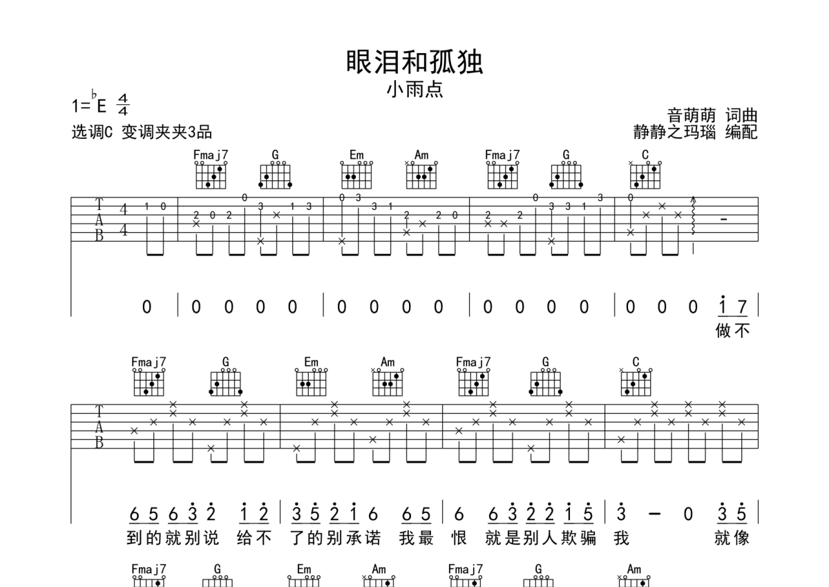 小雨点《眼泪和孤独》吉他谱 - C调弹唱六线谱