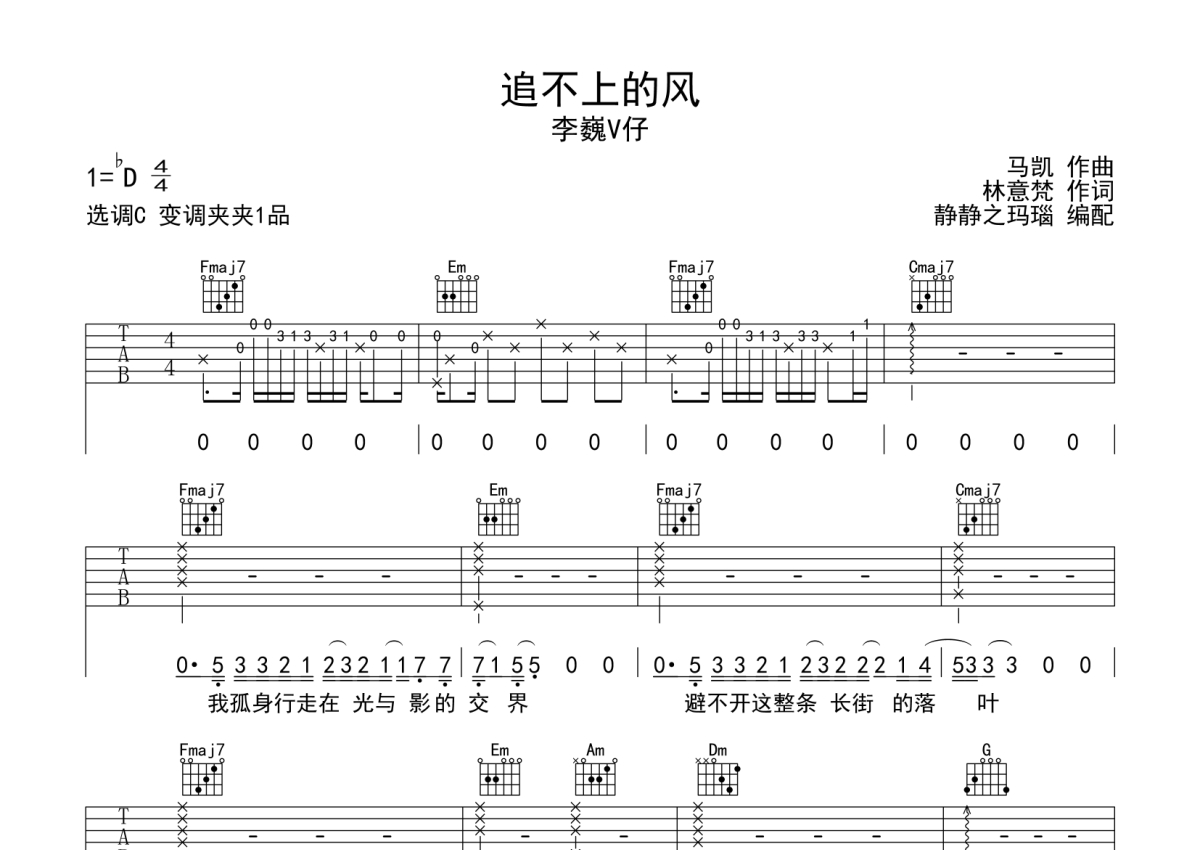李巍V仔《追不上的风》吉他谱 - C调弹唱六线谱