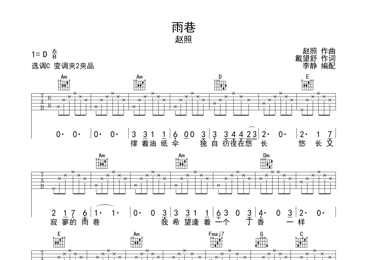 赵照《雨巷》吉他谱 - C调弹唱六线谱