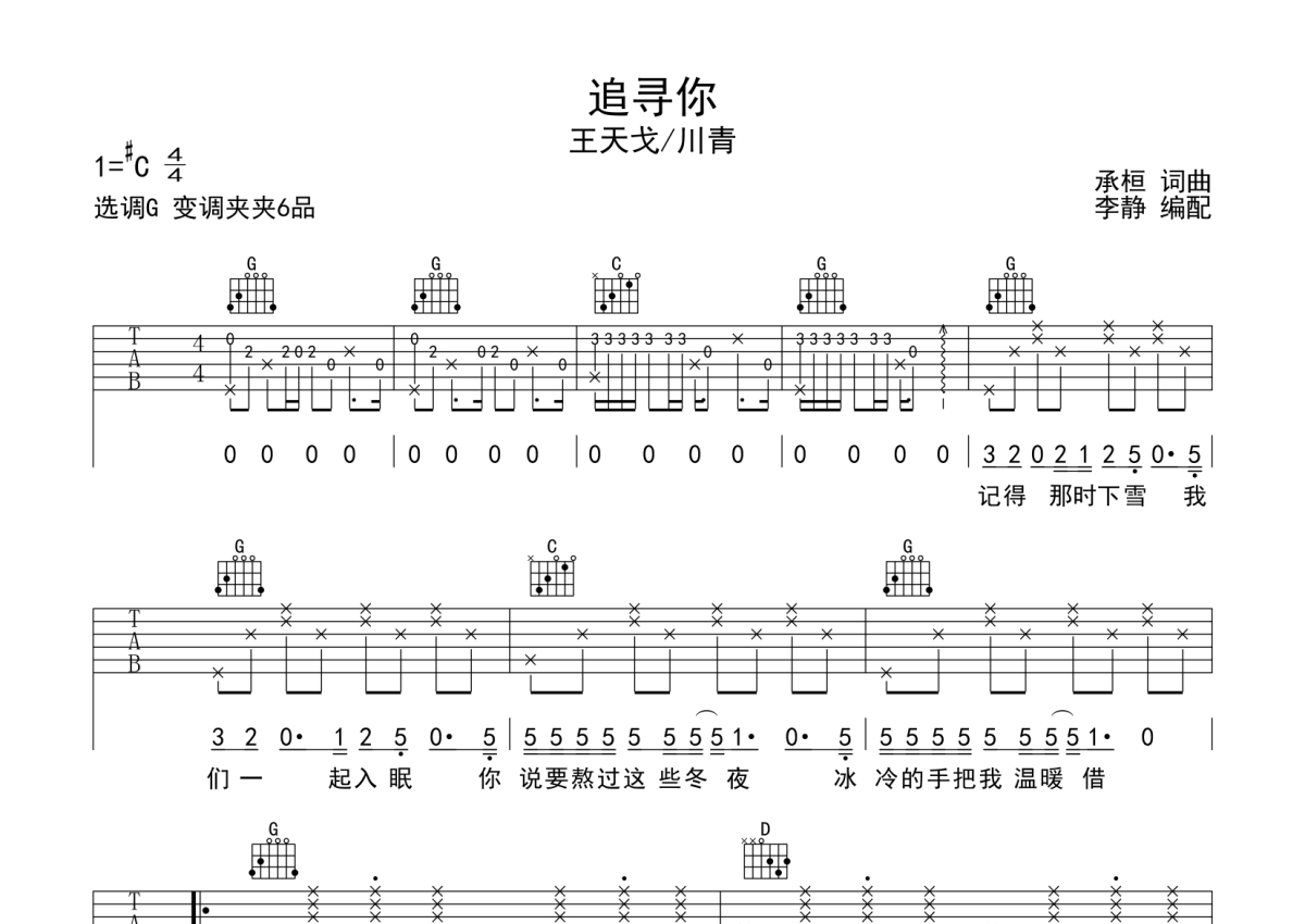 王天戈/川青《追寻你》吉他谱 - G调弹唱六线谱