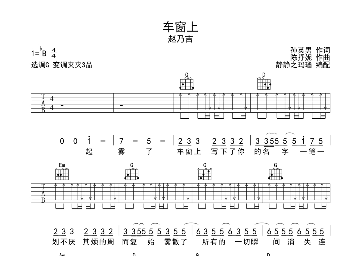 赵乃吉《车窗上》吉他谱 - G调弹唱六线谱