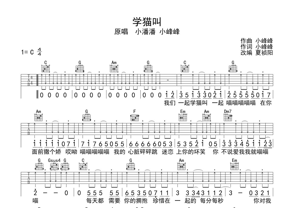 《学猫叫》是小潘潘/小峰峰演唱的一首歌曲,本吉他谱采用的是C调指法编配,这份吉他谱共有两张高清图谱,图谱由 @梦马音乐官方 编配上传,图谱使用六线谱编配,包含吉他和弦指法、简谱以及歌词部分,曲谱配备了相关的视频提供浏览,使用这份学猫叫吉他谱,可以让你更加方便地掌握这首歌曲的弹唱技巧,快来尝试吧。一首甜蜜的宠溺情歌,网络热门抖音歌曲,学猫叫六线谱,C调指法编配,夏祯阳老师演奏要点讲解:这首歌基本都是一个切音的节奏型。大家需要掌握切音。和弦是常规和弦,并没有难度。间奏和尾奏吉他谱上没有写出来,想弹的可以看视频,并没有难度。很感谢这次跟我合作的稚幼小妹妹。她是西安的一个00后女孩,是在网上征集的歌手。
