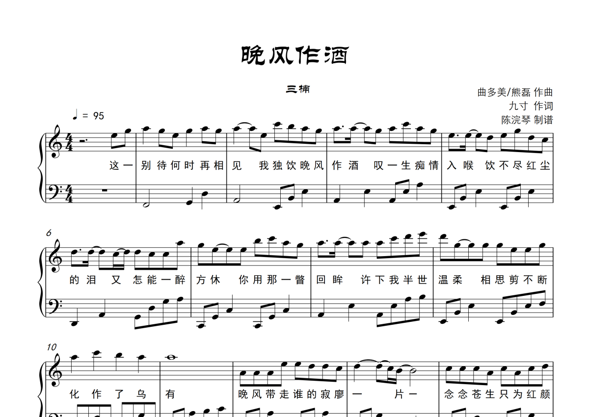 《晚风作酒》是三楠演唱的一首歌曲,C调钢琴谱,附歌词,这份钢琴谱共有两张高清图谱,图谱由 @月隐云先知 编配上传,曲谱配备了相关的音频提供试听,使用这份晚风作酒钢琴谱,可以让你更加方便地掌握这首歌曲的演奏技巧,快来尝试吧。仅录制部分片段供试听。