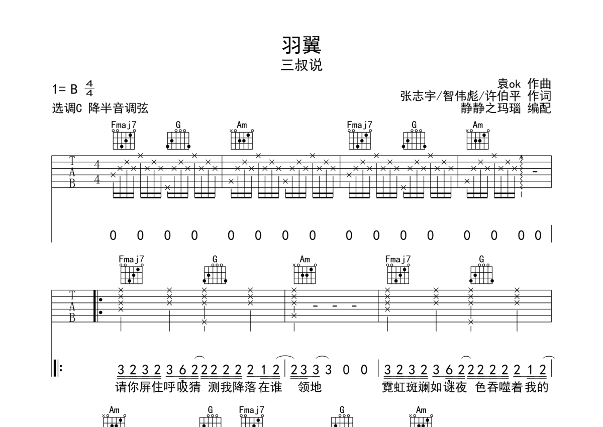 《羽翼》是三叔说演唱的一首歌曲,本吉他谱采用的是C调指法编配,这份吉他谱共有三张高清图谱,图谱由 @静待花开 编配上传,图谱使用六线谱编配,包含吉他和弦指法、简谱以及歌词部分,使用这份羽翼吉他谱,可以让你更加方便地掌握这首歌曲的弹唱技巧,快来尝试吧。本谱采用C调和弦指法编配,节奏4/4拍,曲速85拍每分钟,弹唱建议降半音调弦,指法简单。