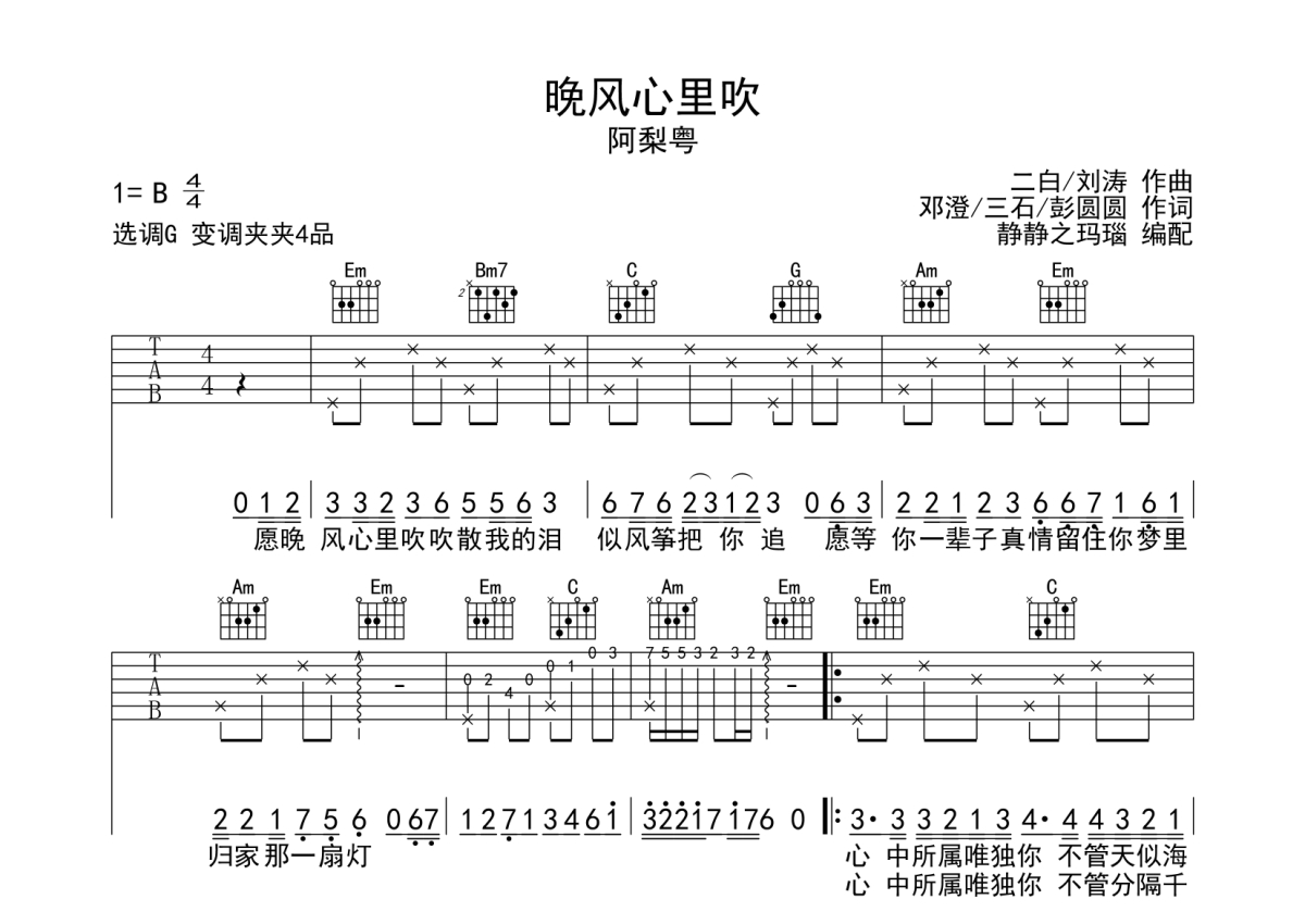 阿梨粤《晚风心里吹》吉他谱 - G调弹唱六线谱