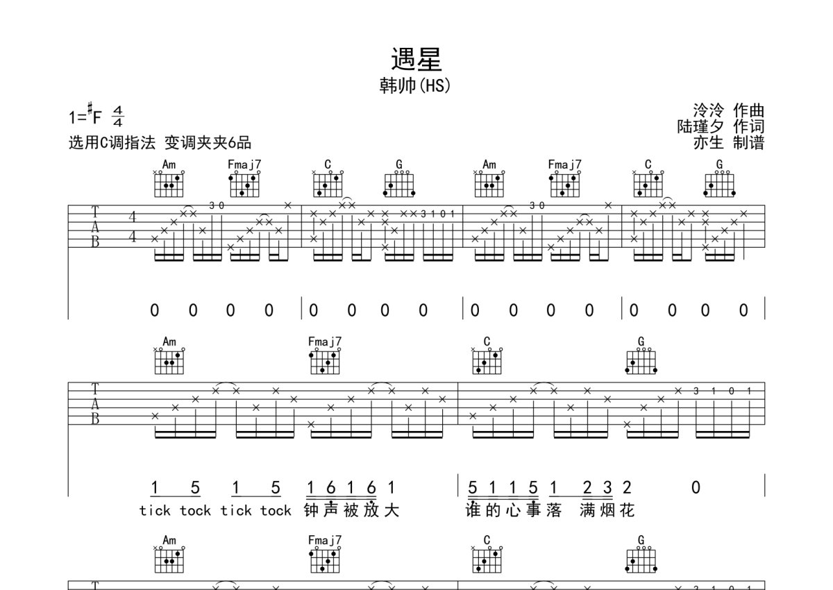 韩帅《遇星》吉他谱 - C调弹唱六线谱