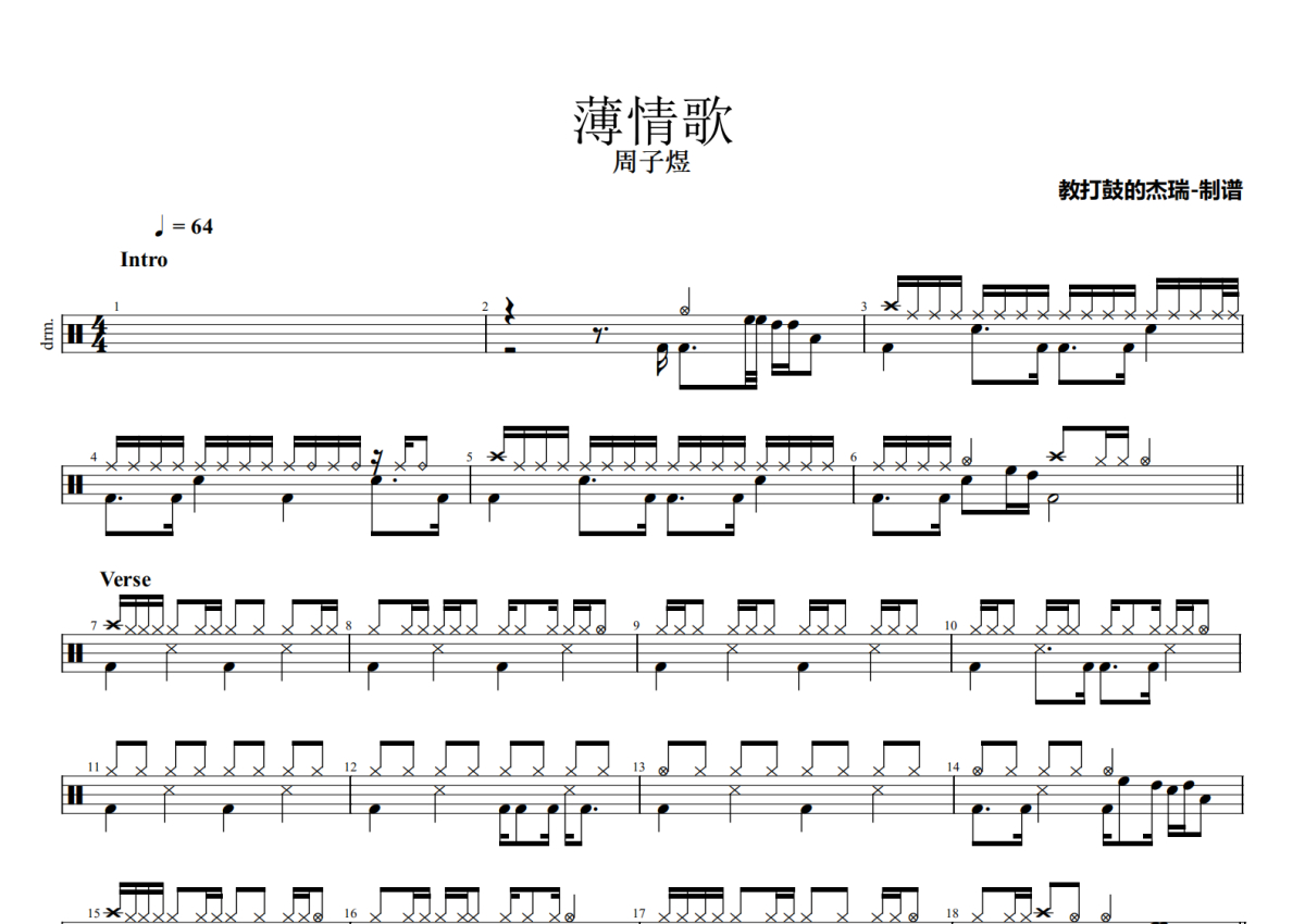 周子煜《薄情歌》鼓谱 - 架子鼓谱