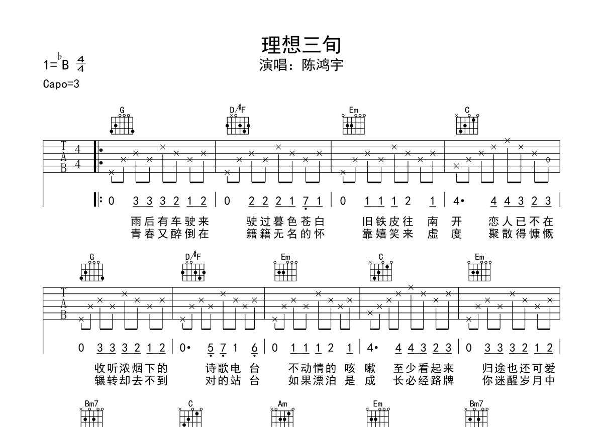 陈鸿宇《理想三旬》吉他谱 - G调弹唱六线谱