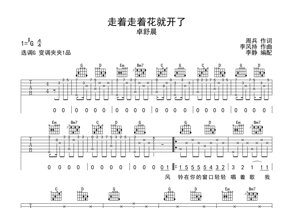 卓舒晨《走着走着花就开了》吉他谱 - G调弹唱六线谱