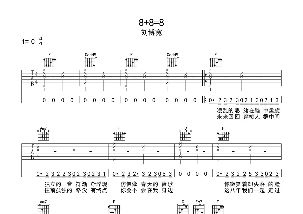 刘博宽《8+8=8》吉他谱 - C调弹唱六线谱