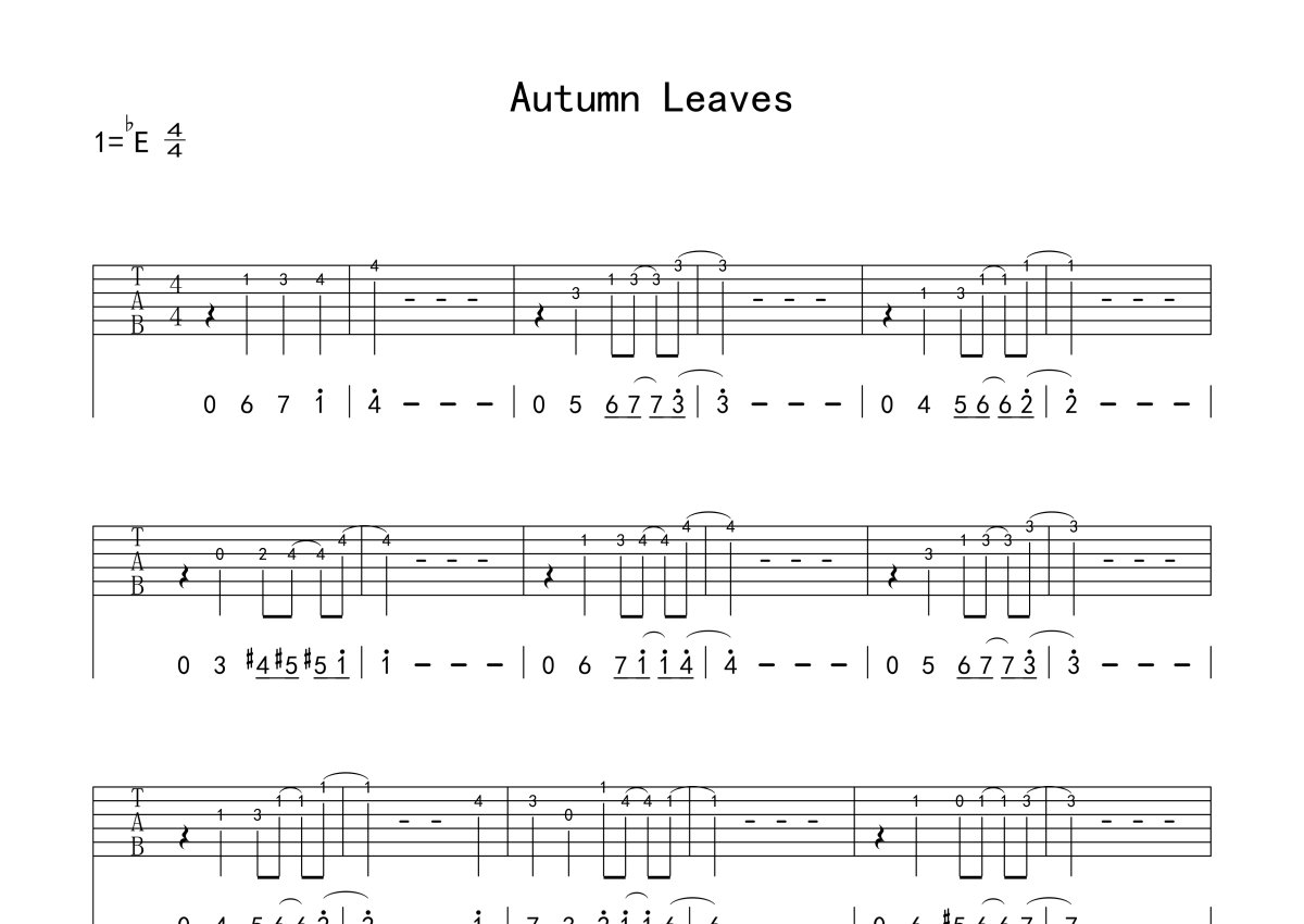 《Autumn Leaves》是Eric Clapton演唱的一首歌曲,这份吉他谱共有一张高清图谱,图谱由 @随心谱 编配上传,图谱使用六线谱编配,使用这份Autumn Leaves吉他谱,可以让你更加方便地掌握这首歌曲的演奏技巧,快来尝试吧。