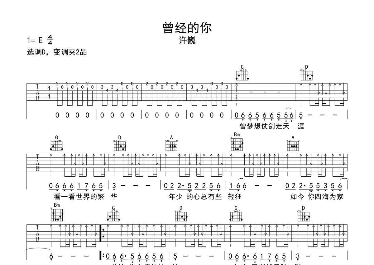 许巍《曾经的你》吉他谱 - D调弹唱六线谱