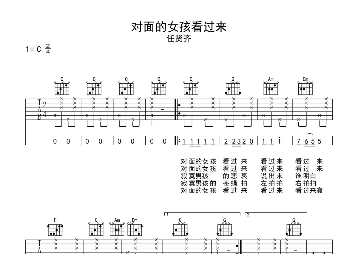 任贤齐《对面的女孩看过来》吉他谱 - C调弹唱六线谱