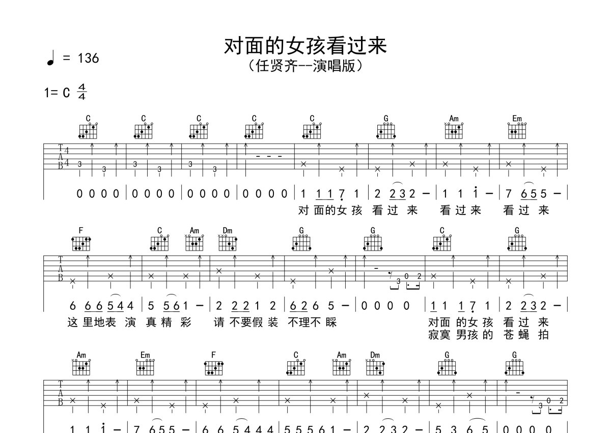 任贤齐《对面的女孩看过来》吉他谱 - C调弹唱六线谱 - 演唱版