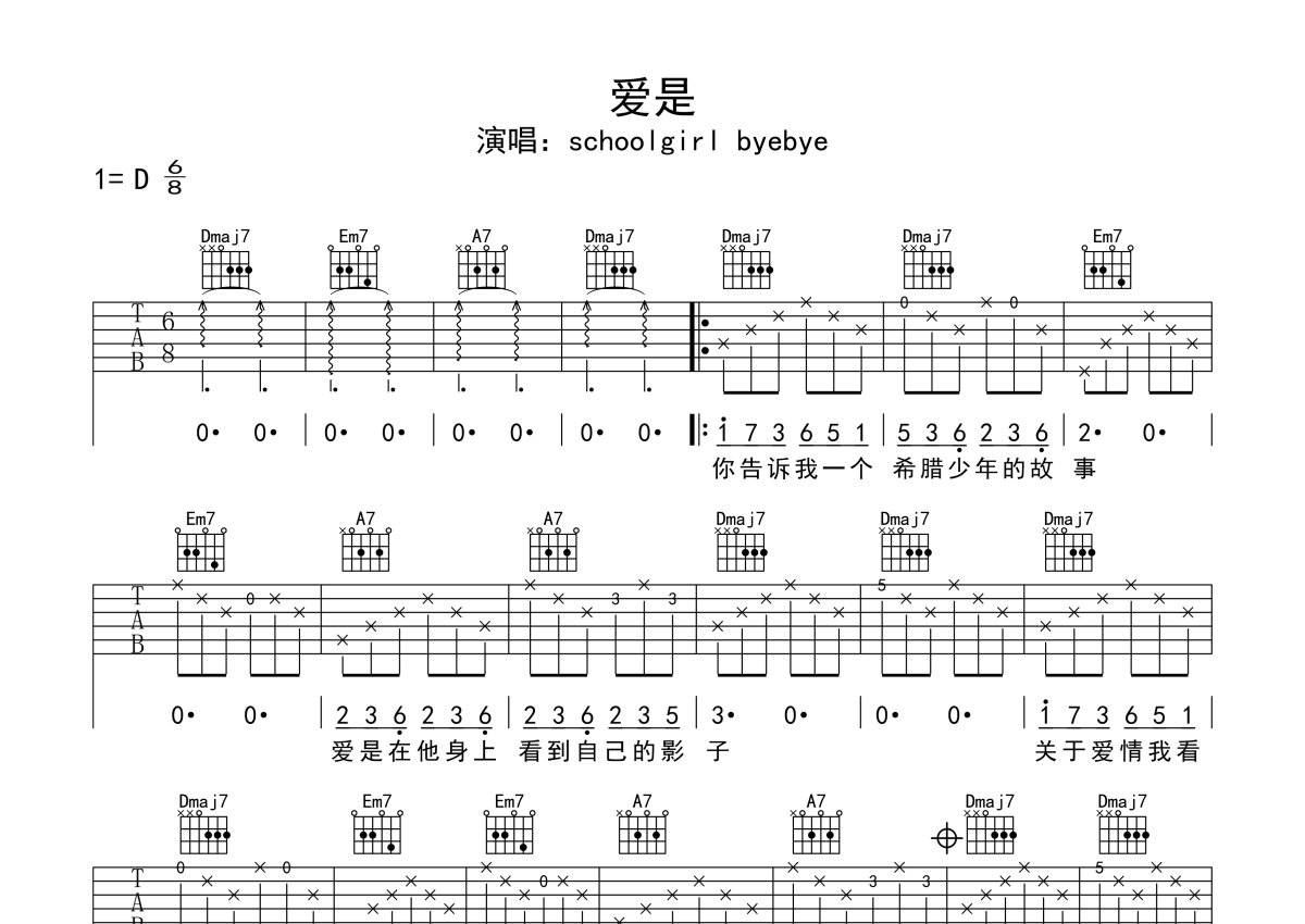 schoolgirl byebye《爱是》吉他谱 - D调弹唱六线谱