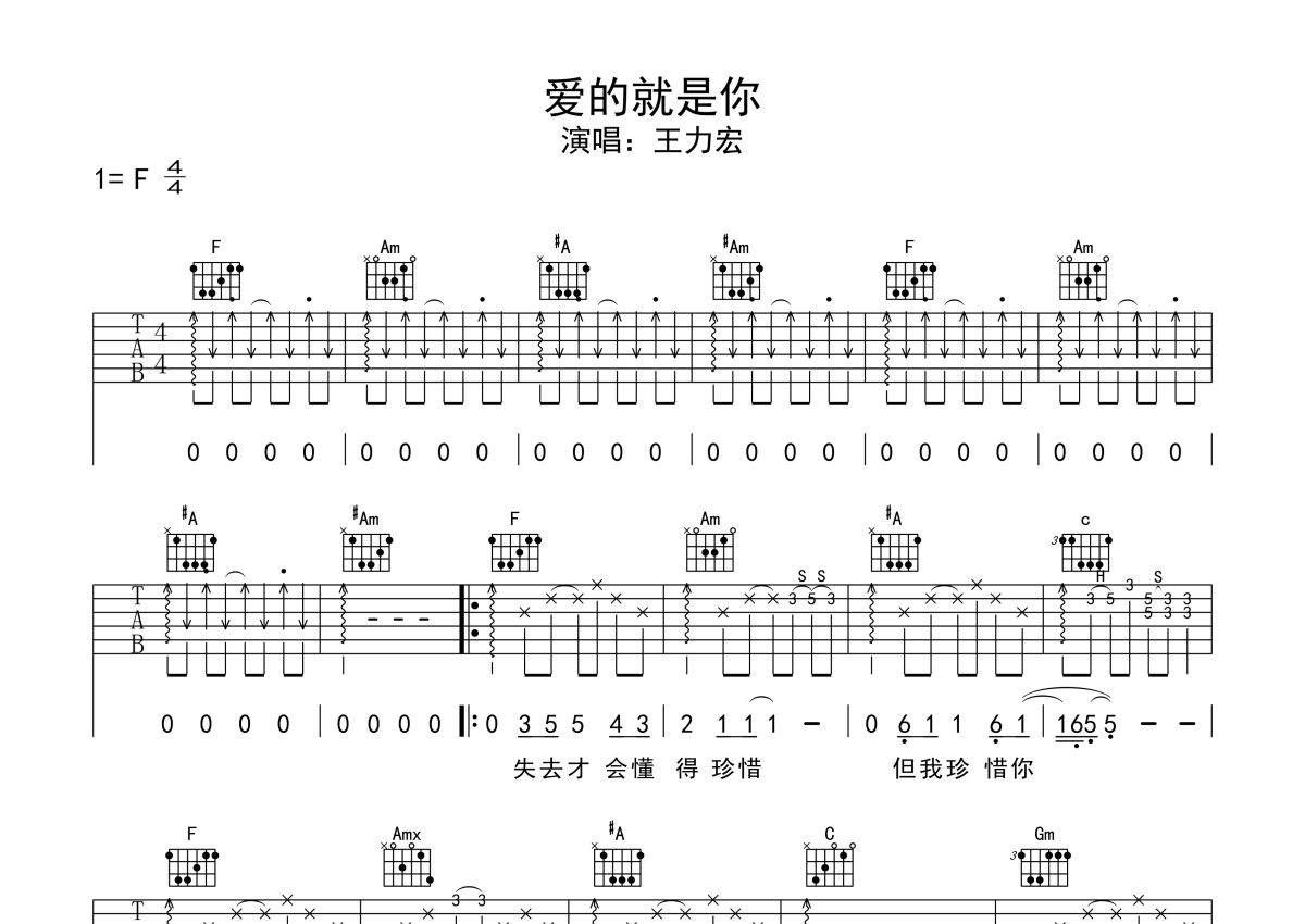 王力宏《爱的就是你》吉他谱 - F调弹唱六线谱