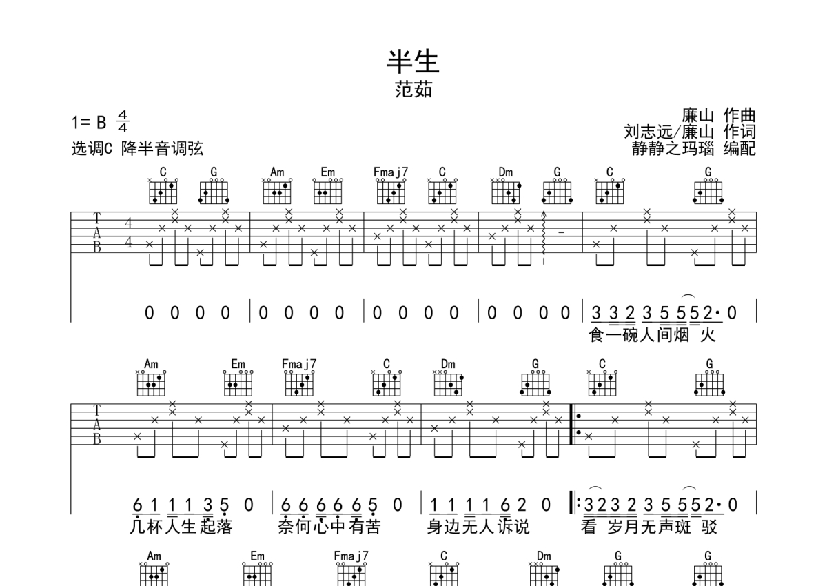 范茹《半生》吉他谱 - C调弹唱六线谱
