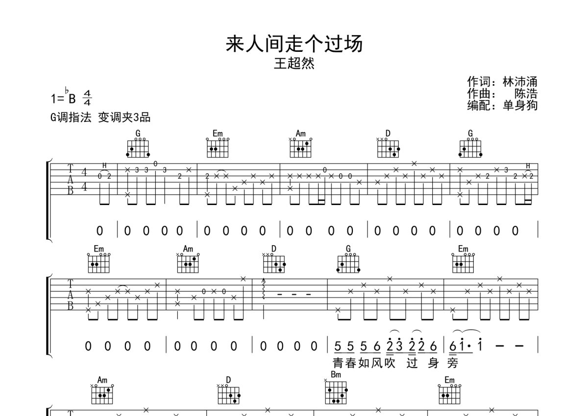 王超然《来人间走个过场》吉他谱 - G调弹唱六线谱