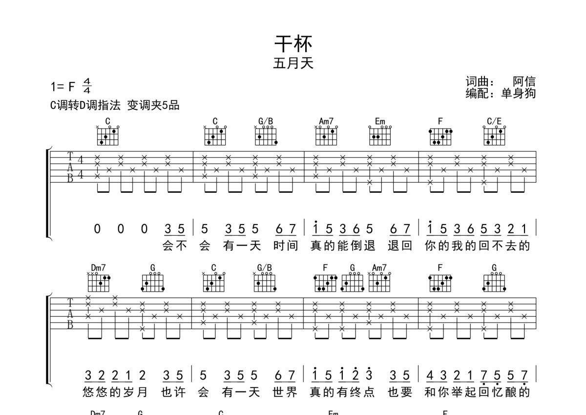 五月天《干杯》吉他谱 - C调弹唱六线谱