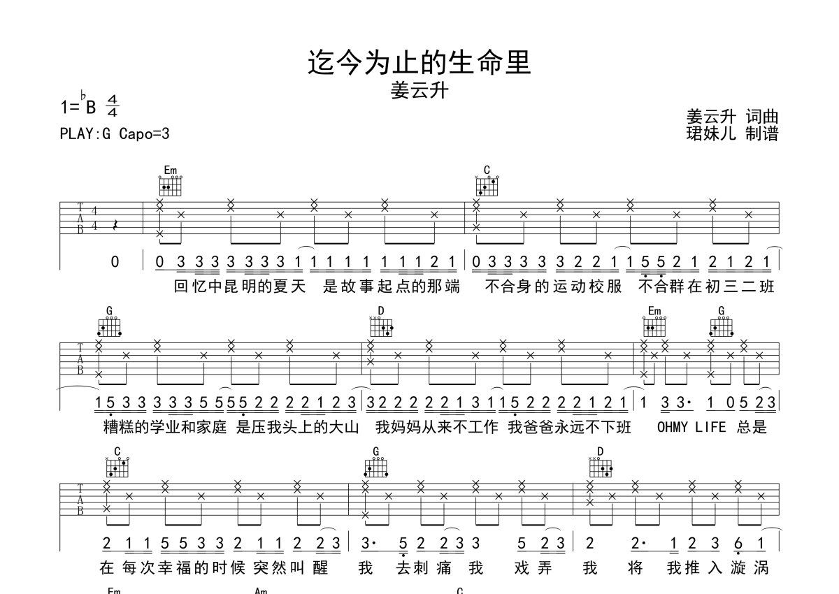 姜云升《迄今为止的生命里》吉他谱 - G调弹唱六线谱