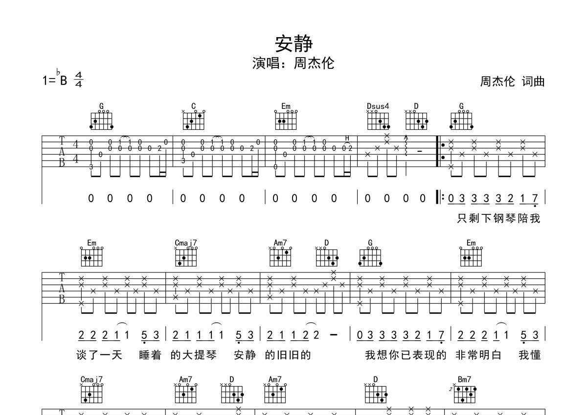 周杰伦《安静》吉他谱 - G调弹唱六线谱