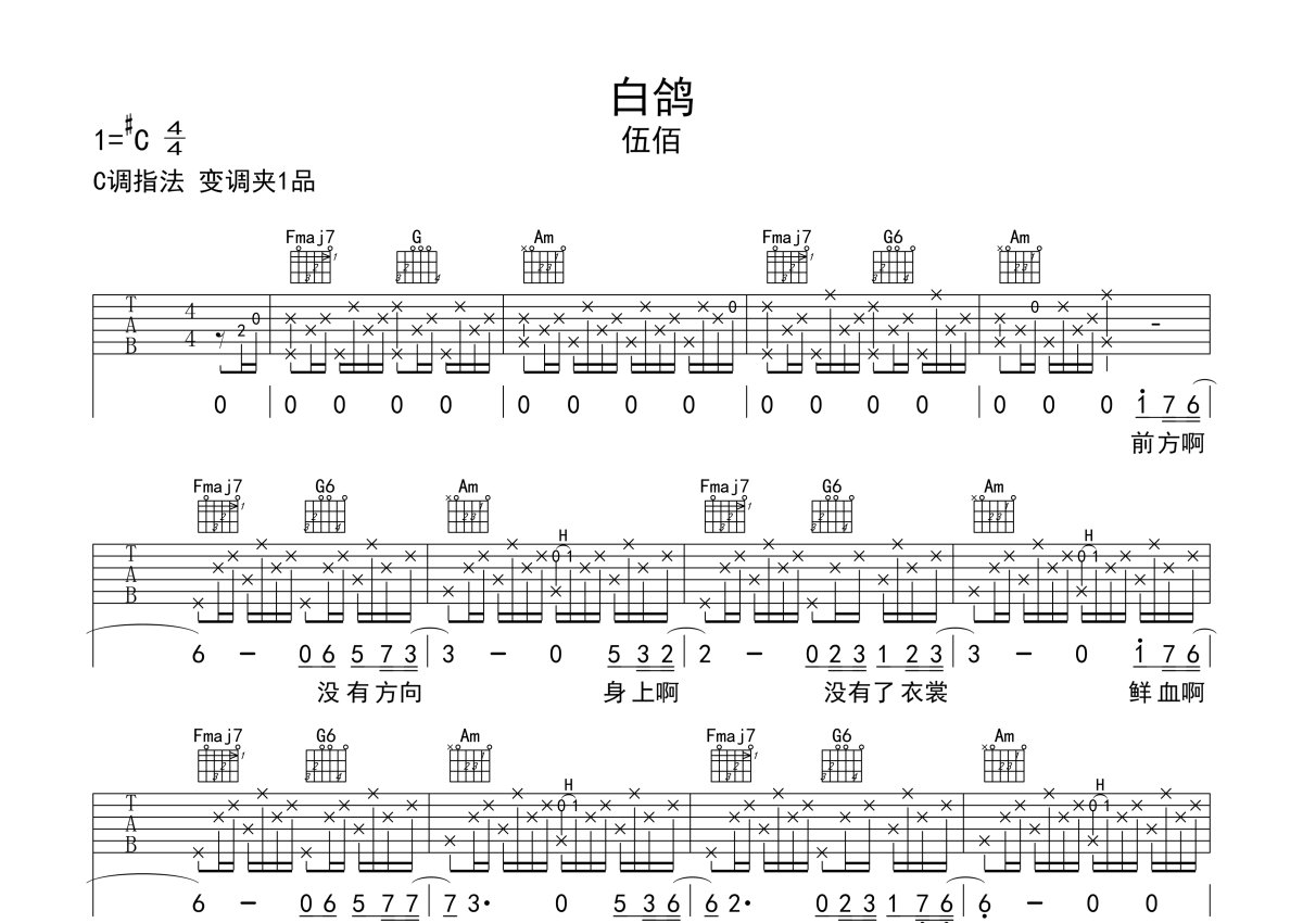 伍佰《白鸽》吉他谱 - C调弹唱六线谱