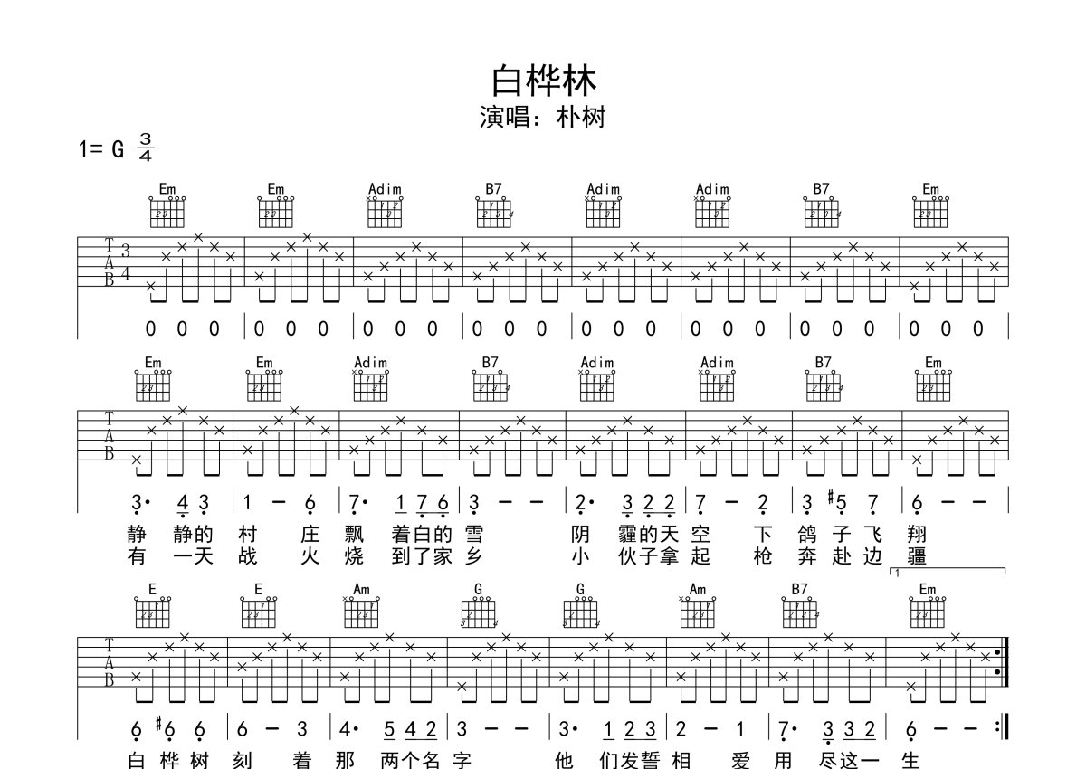 朴树《白桦林》吉他谱 - G调弹唱六线谱