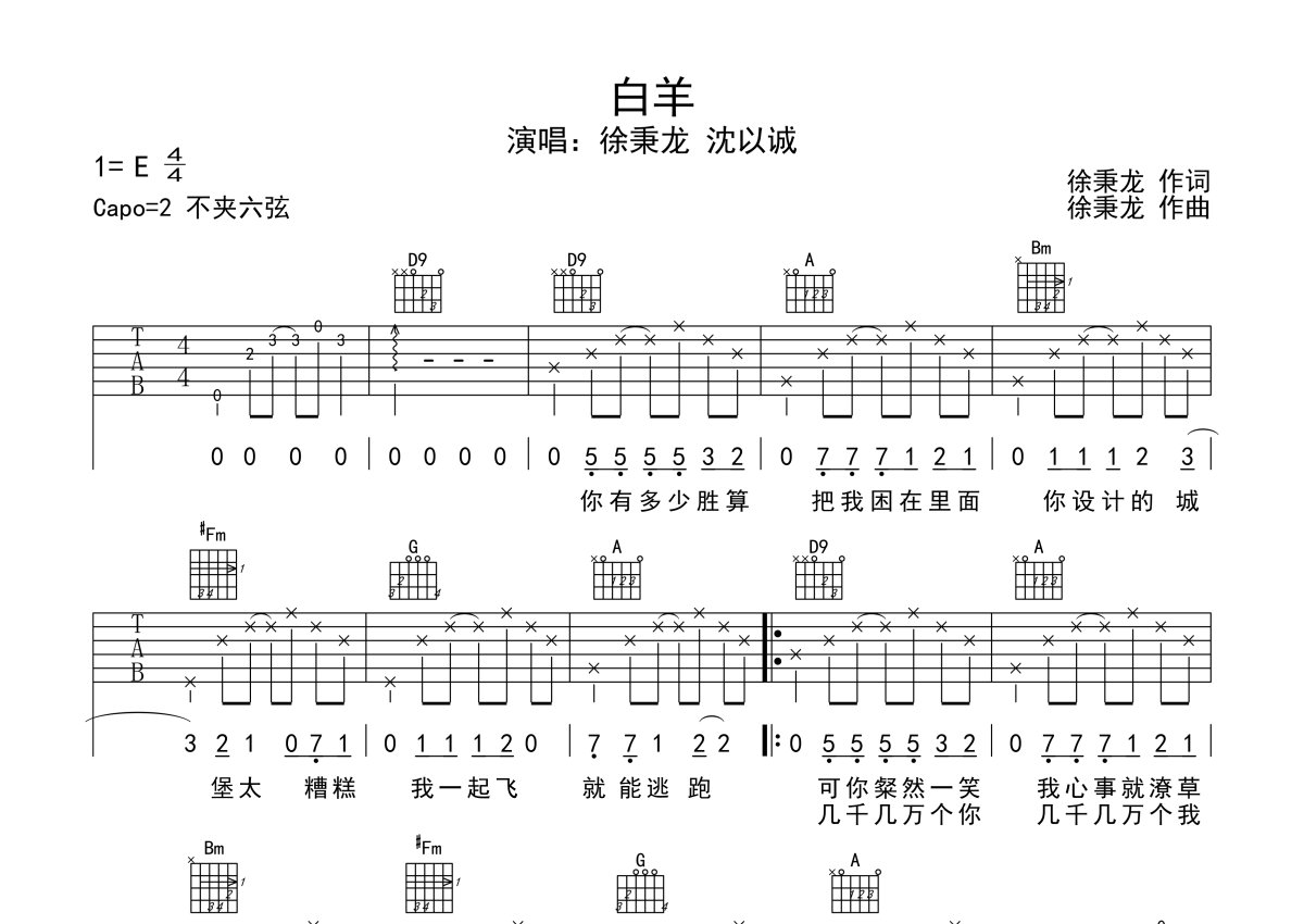徐秉龙/沈以诚《白羊》吉他谱 - D调弹唱六线谱