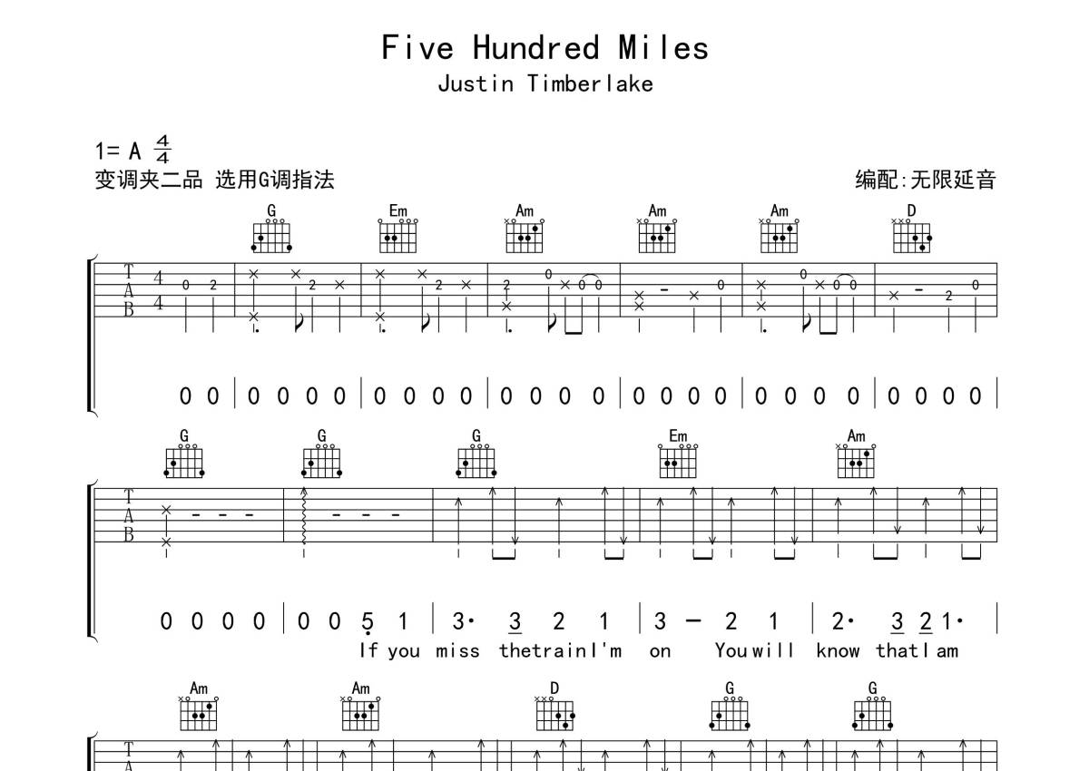 《Five Hundred miles》是Justin Timberlake/Carey Mulligan/Stark Sands演唱的一首歌曲,歌曲原调为A调,但由于原调指法比较难,为了方便弹奏,本吉他谱采用的是G调指法编配,变调夹2品弹奏即为原调,当然也可以根据自己的音域改变变调夹位置,或者通过改变和弦调性,以方便自己弹奏,这份吉他谱共有四张高清图谱,图谱由 @无限延音 编配上传,图谱使用六线谱编配,包含吉他和弦指法、简谱以及歌词部分,使用这份Five Hundred miles吉他谱,可以让你更加方便地掌握这首歌曲的弹唱技巧,快来尝试吧。