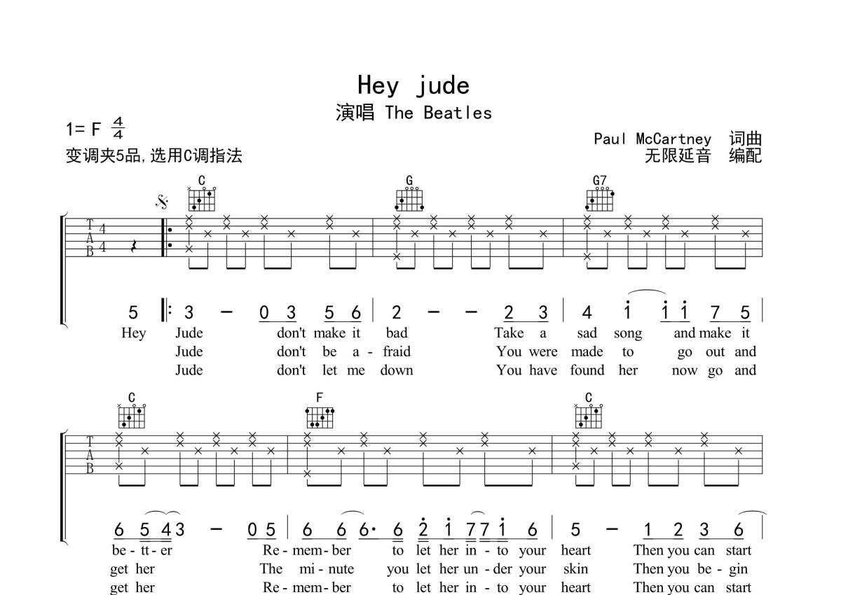 The Beatles《hey jude》吉他谱 - C调弹唱六线谱