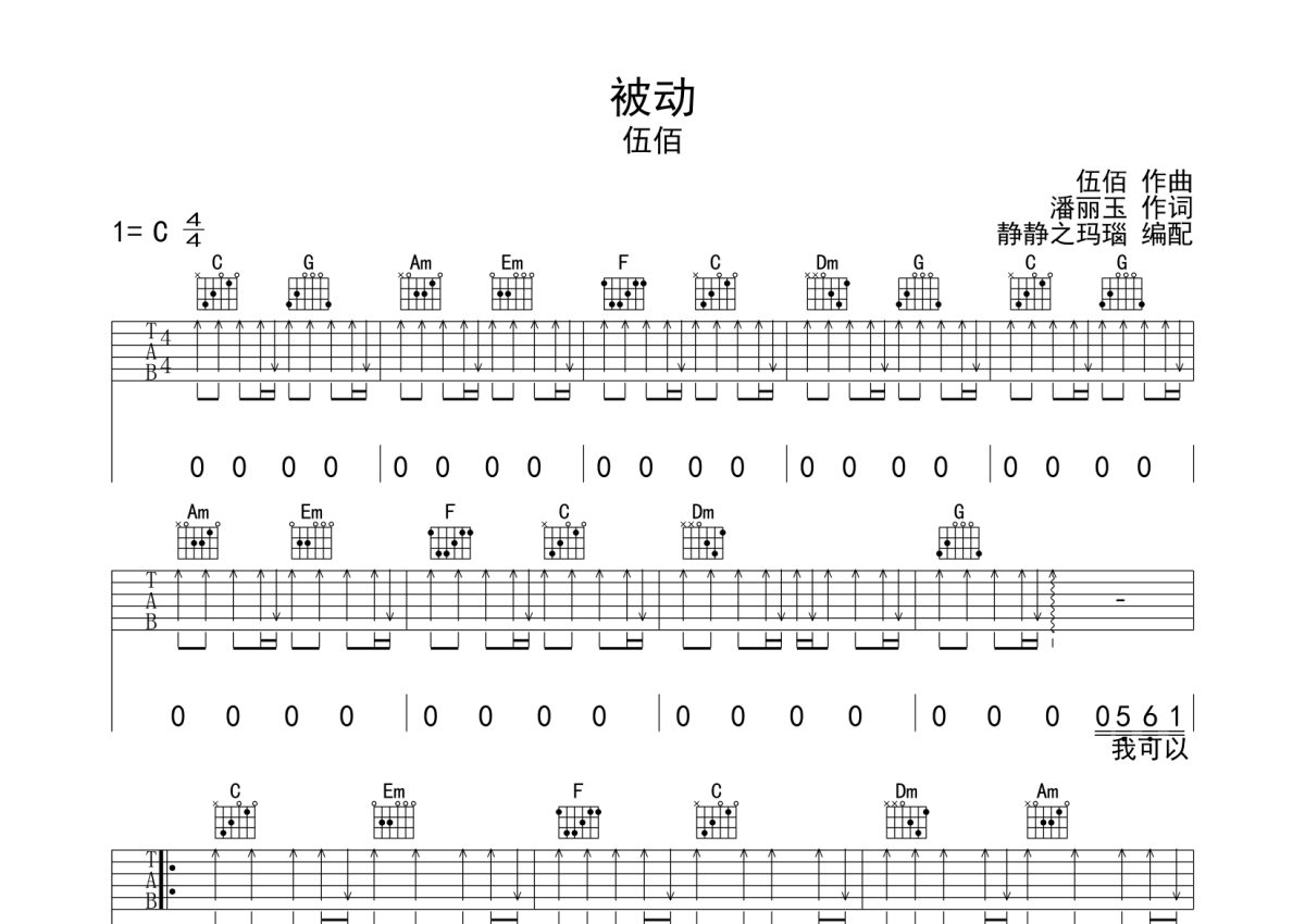 《被动》是伍佰演唱的一首歌曲,扫弦版,本吉他谱采用的是C调指法编配,这份吉他谱共有两张高清图谱,图谱由 @静待花开 编配上传,图谱使用六线谱编配,包含吉他和弦指法、简谱以及歌词部分,使用这份被动吉他谱,可以让你更加方便地掌握这首歌曲的弹唱技巧,快来尝试吧。本谱采用C调和弦指法编配,节奏4/4拍,曲速80拍每分钟,弹唱建议不夹变调夹,指法简单。
