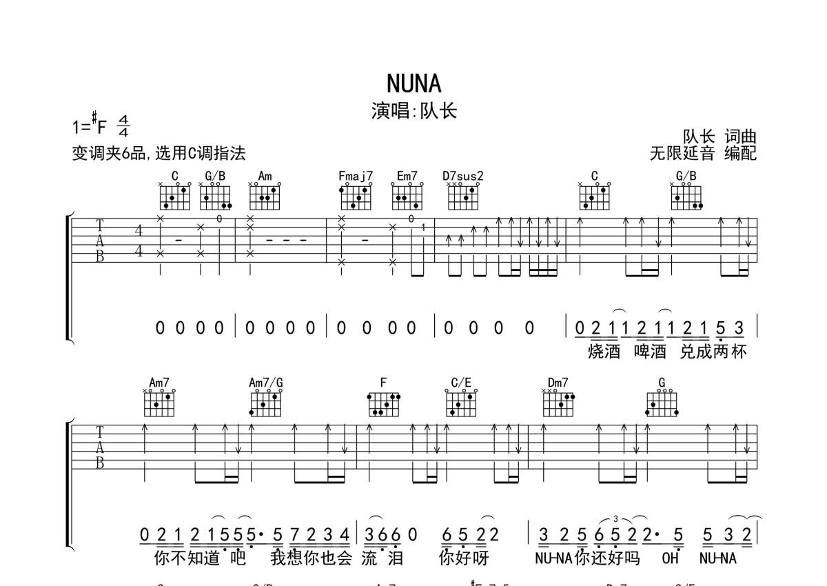 队长《NUNA》吉他谱 - C调弹唱六线谱