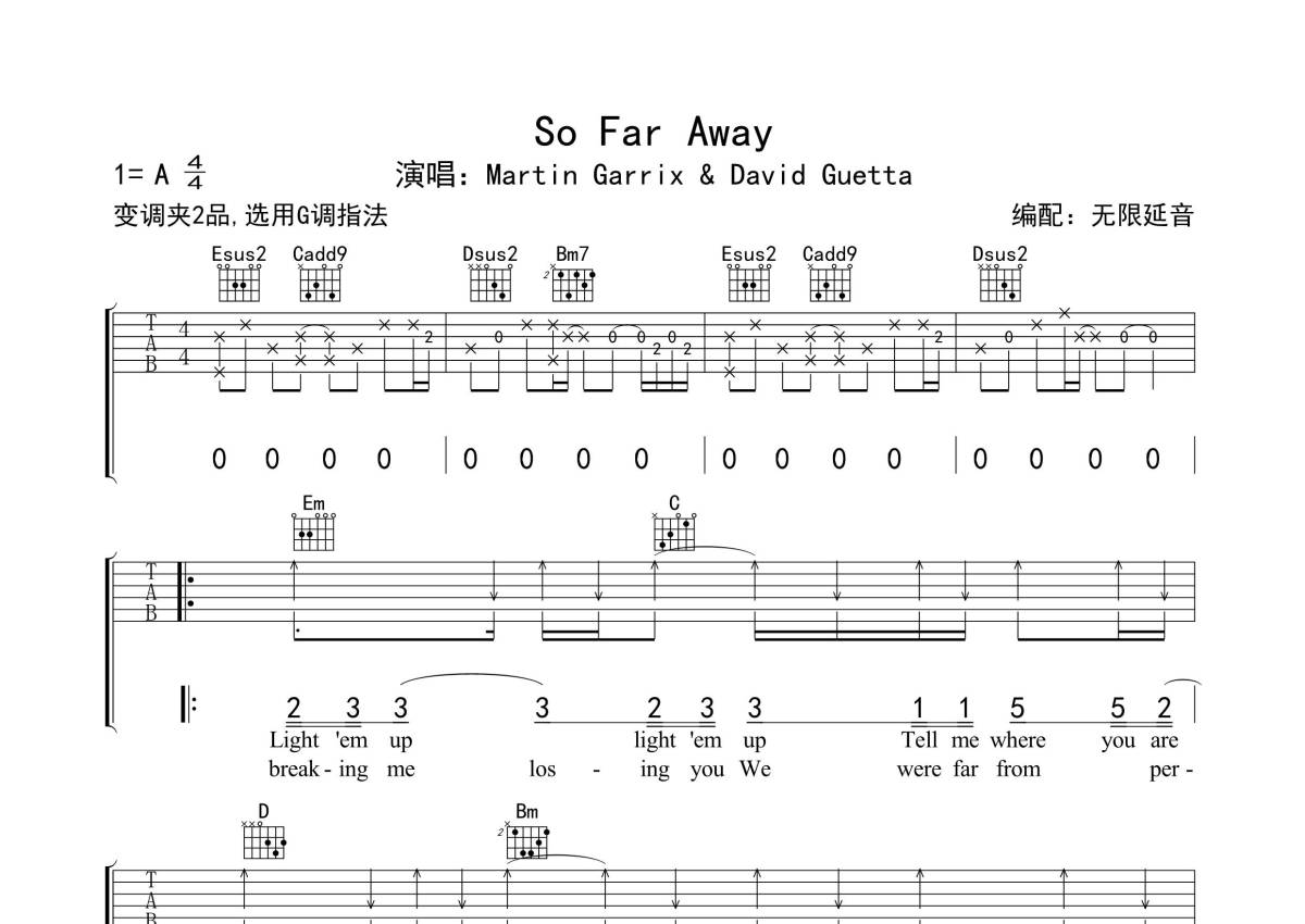 《so far away》是Martin Garrix /David Guetta演唱的一首歌曲,歌曲原调为A调,但由于原调指法比较难,为了方便弹奏,本吉他谱采用的是G调指法编配,变调夹2品弹奏即为原调,当然也可以根据自己的音域改变变调夹位置,或者通过改变和弦调性,以方便自己弹奏,这份吉他谱共有四张高清图谱,图谱由 @无限延音 编配上传,图谱使用六线谱编配,包含吉他和弦指法、简谱以及歌词部分,使用这份so far away吉他谱,可以让你更加方便地掌握这首歌曲的弹唱技巧,快来尝试吧。