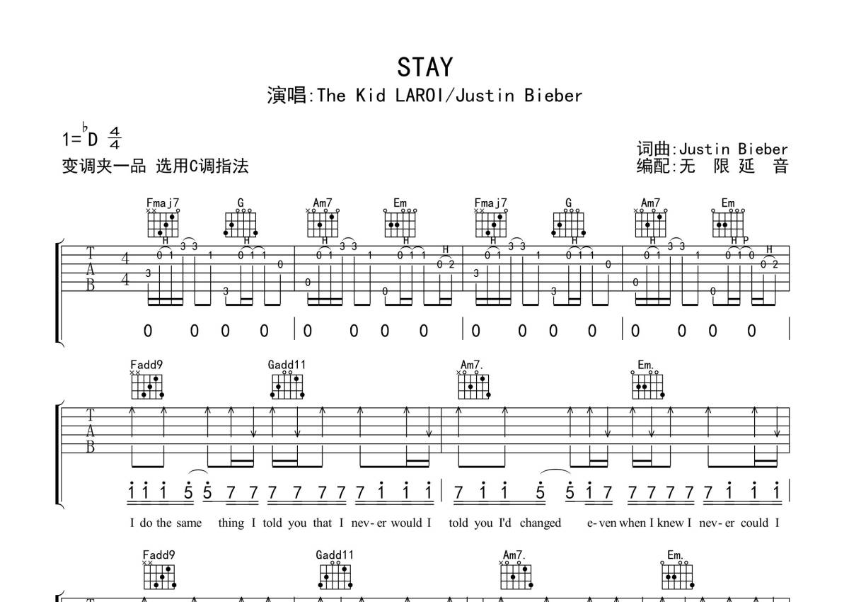 《Stay》是The Kid LAROI / Justin Bieber演唱的一首歌曲,歌曲原调为Db调,但由于原调指法比较难,为了方便弹奏,本吉他谱采用的是C调指法编配,变调夹1品弹奏即为原调,当然也可以根据自己的音域改变变调夹位置,或者通过改变和弦调性,以方便自己弹奏,这份吉他谱共有三张高清图谱,图谱由 @无限延音 编配上传,图谱使用六线谱编配,包含吉他和弦指法、简谱以及歌词部分,使用这份Stay吉他谱,可以让你更加方便地掌握这首歌曲的弹唱技巧,快来尝试吧。